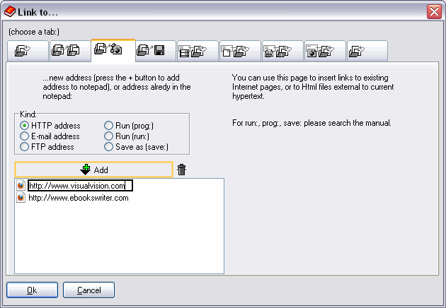 With the third tab you can place a link to anywhere on the Internet. You can also place a mail address (for example mailto:youremail@yourdomain.com), for the final user to send an email. Click on the image to get Help: