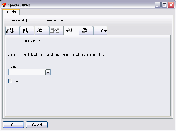 Special links: Anchor - Main, new browser - Separate windows - To different frames - Close window - Various - Cart