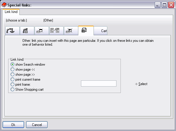 Special links: Anchor - Main, new browser - Separate windows - To different frames - Close window - Various - Cart