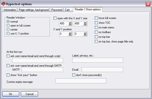 In this window you can set the properties of the reader screen, i.e. how the ebook will open on the end user's PC, and several other things. Click on the image to get Help (see also: hypertext/ebook options, page settings, background; passwords, custom passwords for each user; shopping cart; reader and show options).