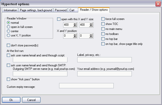 In this window you can set the properties of the reader screen, i.e. how the ebook will open on the end user's PC. You can force the ebook to open in full screen, or with a specified size and position.