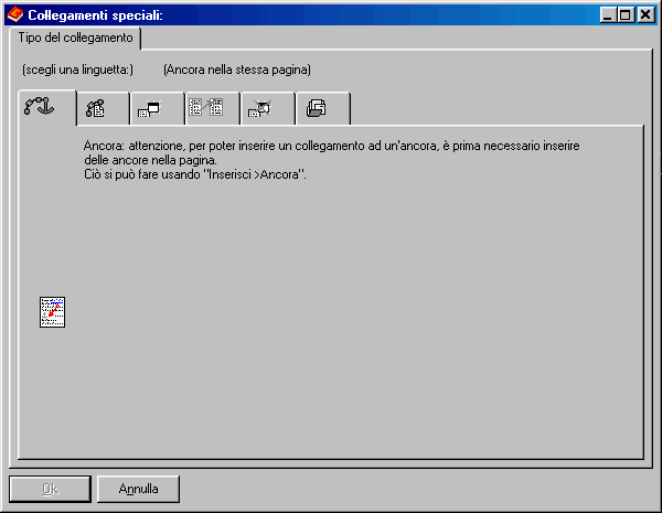 Questa linguetta permette di inserire un collegamento ad un’ancora. Un’ancora è una specie di segnale “invisibile” che può essere piazzato in qualsiasi punto di una pagina (con “Inserisci >Ancora”).