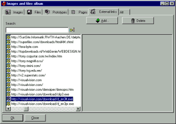 La colección/album interno. Puedes buscar, editar, remplazar, y borrar objetos hipertextuales, tales como imágenes, enlaces con el Internet, páginas etc. Por ejemplo, cuando reemplazas un enlace en un lugar, puedes reemplazarlo en toda la obra.