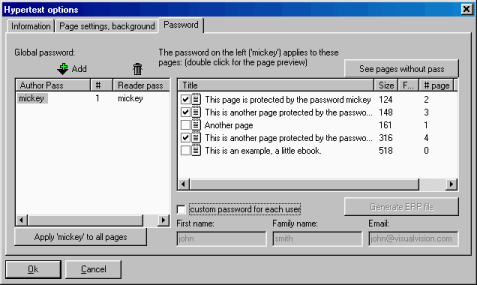 El diálogo de la contraseña. Puedes insertar una lista de contraseñas globales para el e-libro / ebook. Luego, seleccionas una contraseña de la izquierda, y a la derecha seleccionas las páginas del e-libro para asociarse con la contraseña.